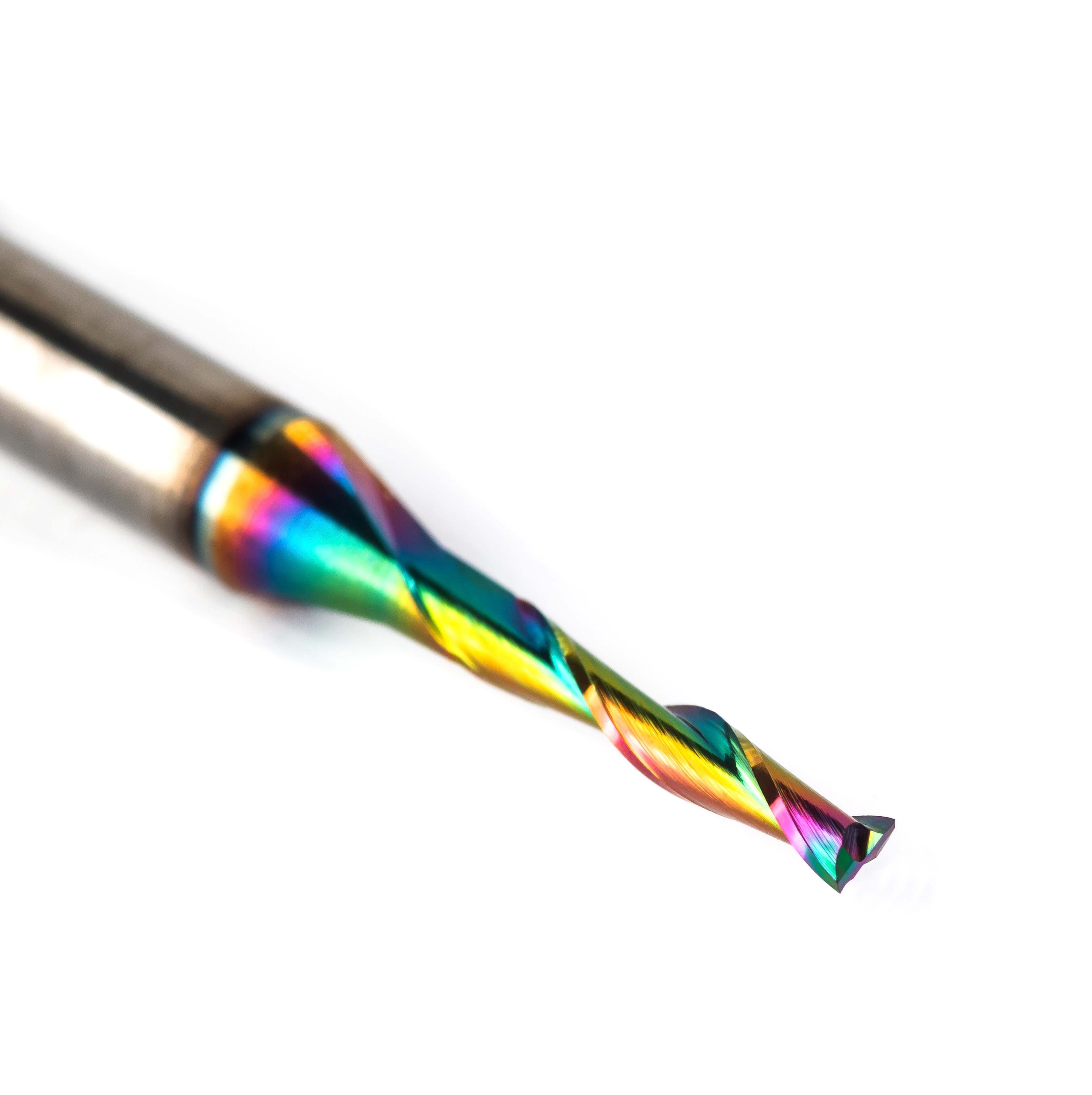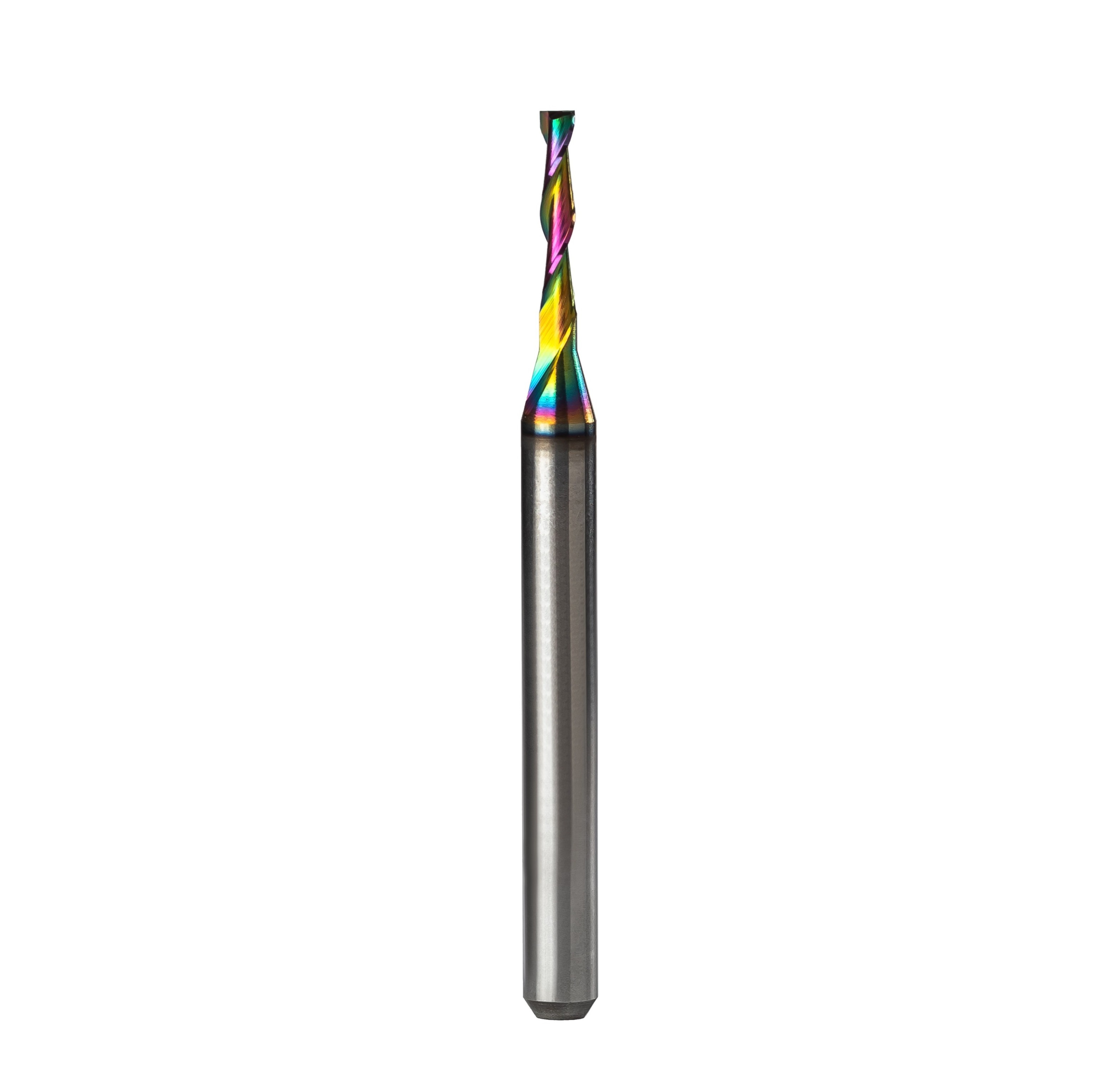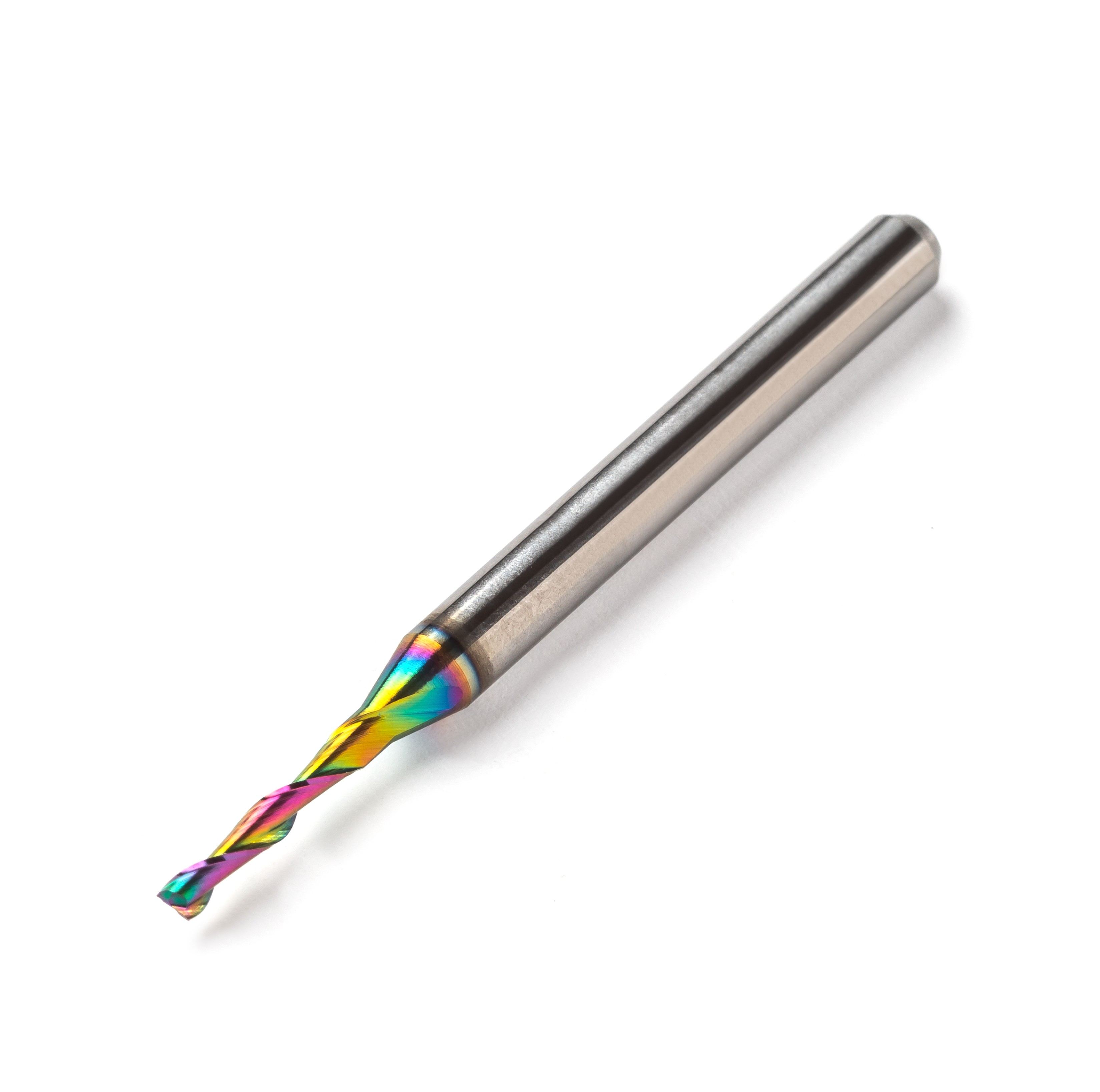 Vollhartmetall Zweischneider mit leichtem Fischschwanzanschliff für präzise Fräsungen. Diese Fräser eignen sich besonders für weichere Leiterplattenwerkstoffe (CEM3, FR2, FR3, PTFE, Aramide oder Prepregs), aber auch Holz, harter Kunststoff, Aluminium, Messing, Kupfer, etc..Eigenschaften:
