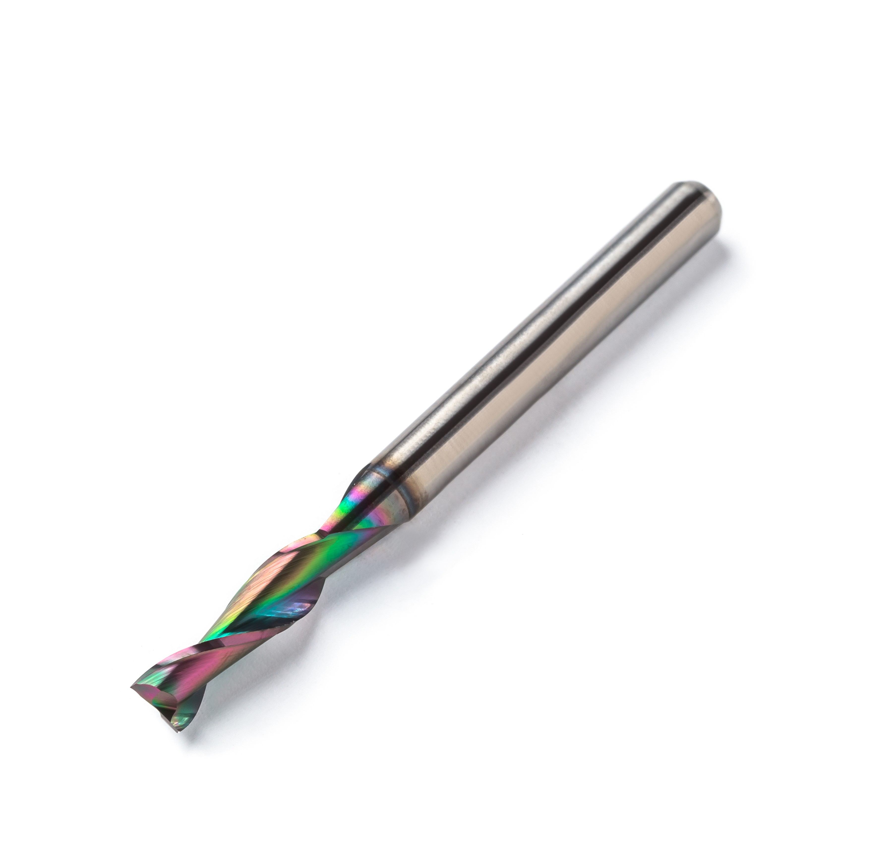 Vollhartmetall Zweischneider mit leichtem Fischschwanzanschliff für präzise Fräsungen. Diese Fräser eignen sich besonders für weichere Leiterplattenwerkstoffe (CEM3, FR2, FR3, PTFE, Aramide oder Prepregs), aber auch Holz, harter Kunststoff, Aluminium, Messing, Kupfer, etc..Eigenschaften: